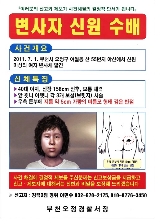 治療方法が少し特殊だったことに注目し、大韓歯科協会に調査を依頼したものの、身元特定には至らなかった。それでも警察は諦めず、遺体の顔を復元してモンタージュを作成。遺体全体をCTスキャンし、頭蓋骨を3D撮影して仮想的な顔面を復元することに成功した。このデータを基に指名手配のチラシを作成し、富川市を含む各地域に掲示するとともに、メディアにも公開したが、被害者の身元特定には至らなかった。